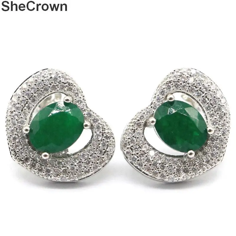 18x15 мм красивая форма сердца настоящий зеленый изумруд Белый CZ женские серебряные серьги-гвоздики