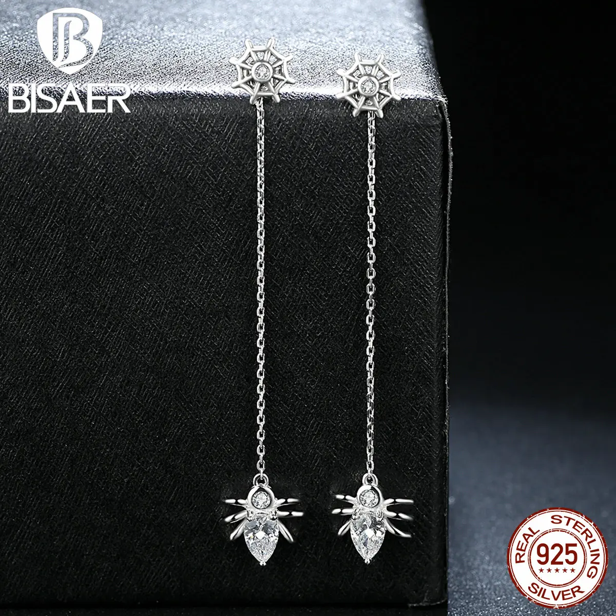 Женские длинные серьги-гвоздики BISAER, длинные серьги-гвоздики из стерлингового серебра 925 пробы на резиновой и обратной стороне паука, модные ювелирные изделия для вечеринок, HSE019
