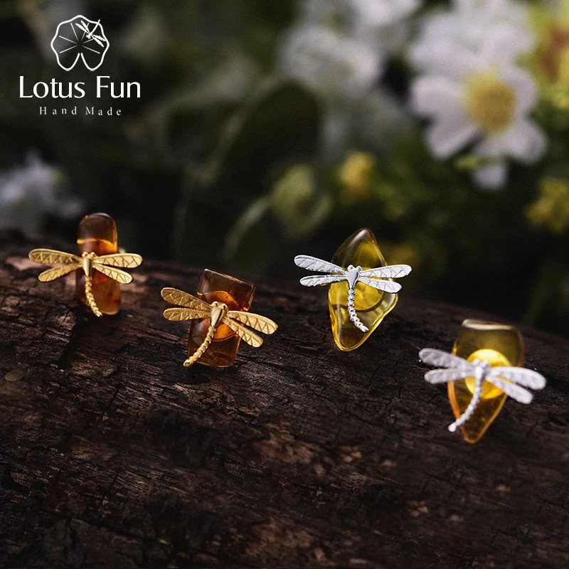Lotus весело Настоящее стерлингового серебра 925 натурального янтаря ручной работы Fine Jewelry Симпатичные Стрекоза серьги стержня для женщин brincos