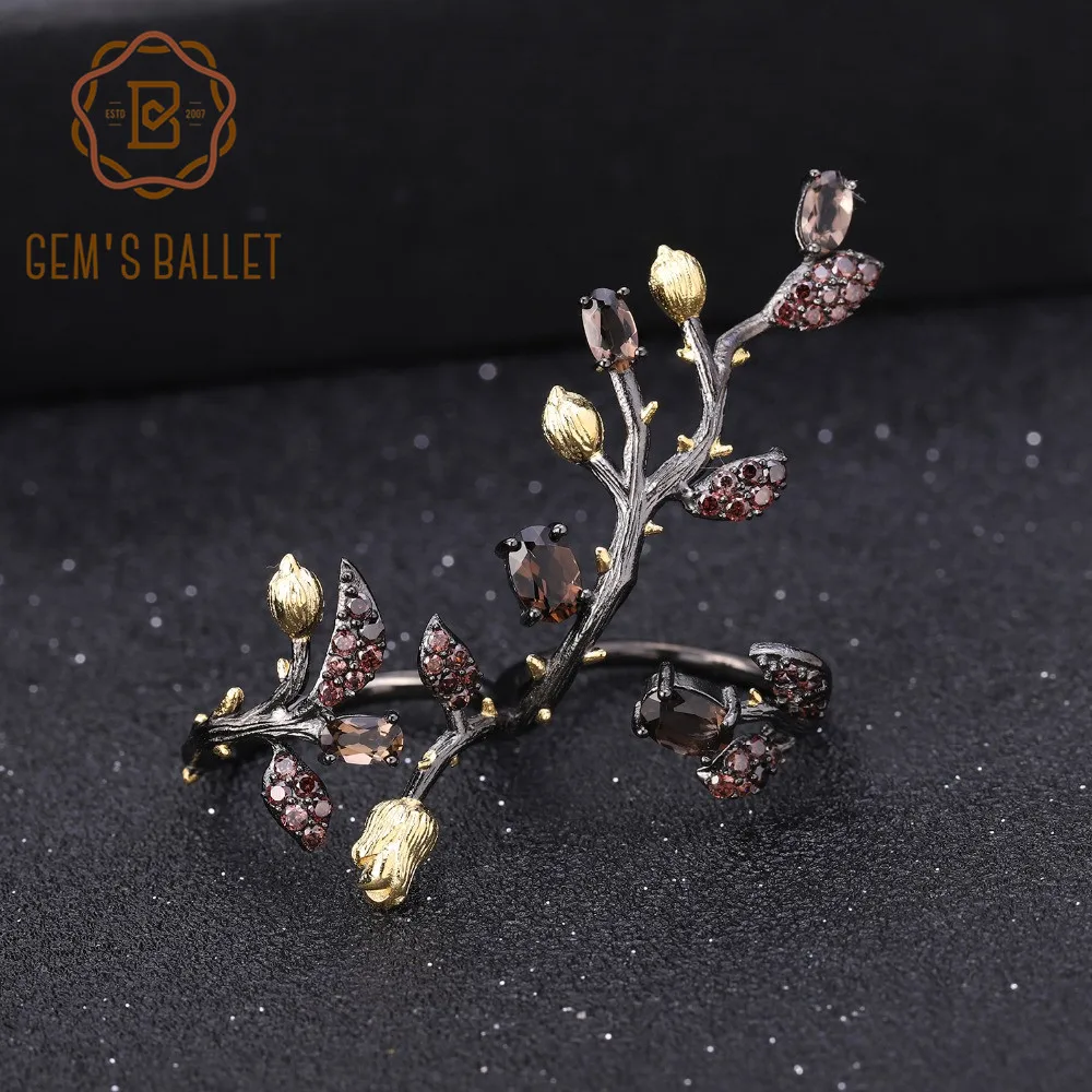 GEM'S балетные 925 пробы Серебряная ветка дерево двойные кольца на пальцы для женщин 1.57Ct Натуральный дымчатый кварц регулируемое кольцо