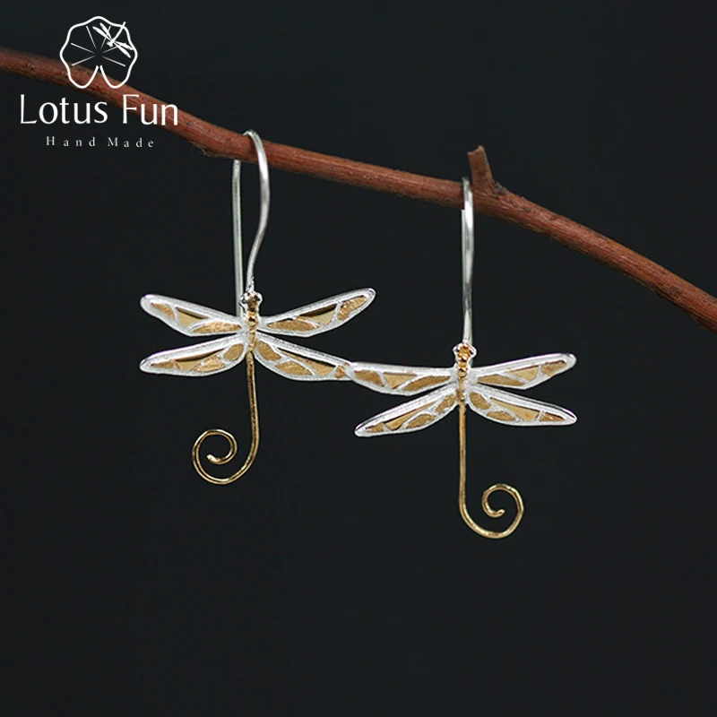 Lotus весело Настоящее стерлингового серебра 925 природных Стиль ручной работы Fine Jewelry Симпатичные Стрекоза серьги для женщин brincos