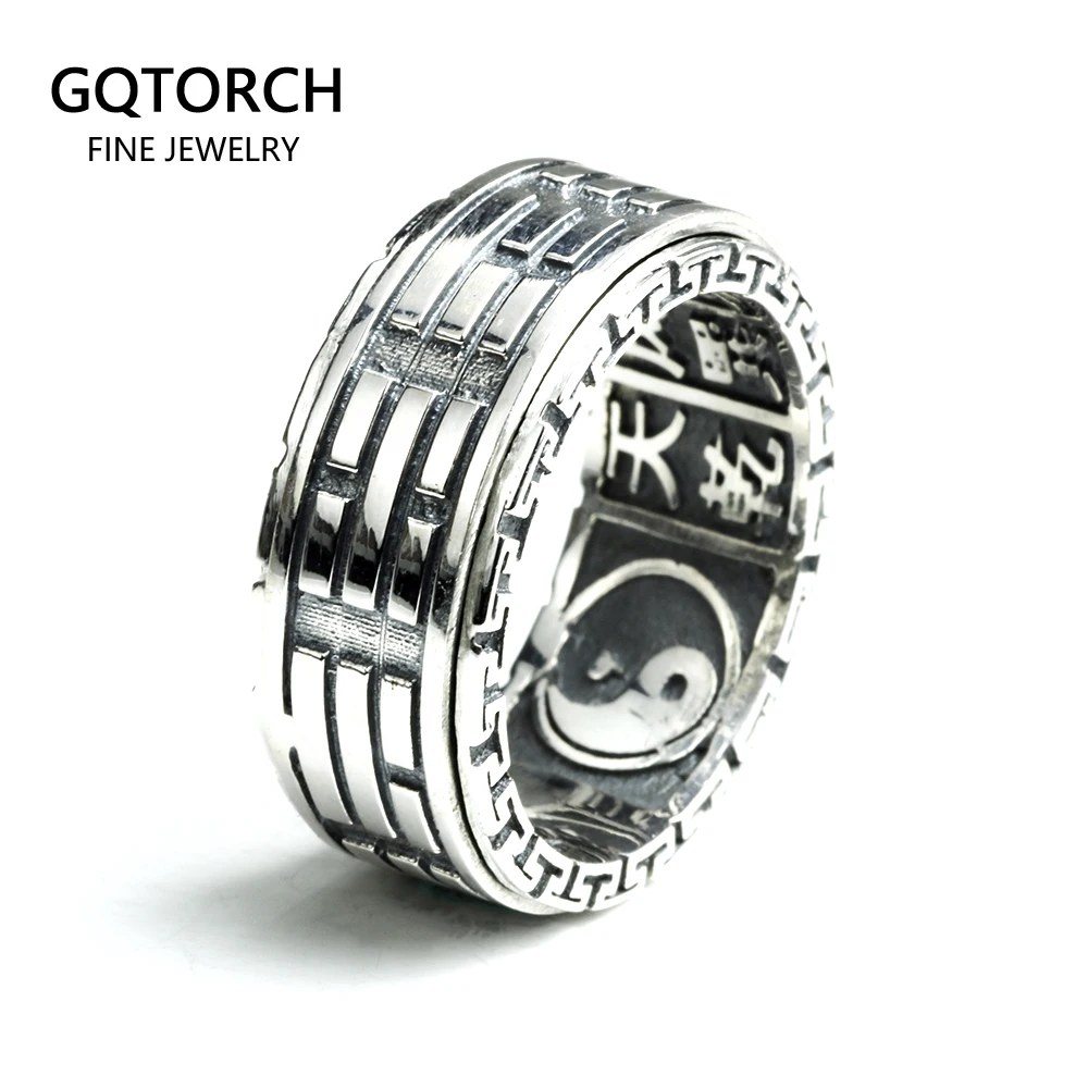 Настоящее 925 пробы серебряные кольца для мужчин вертушка вращающаяся резьба Taiji Bagua Yin Yang с винтажным узором Great Wall