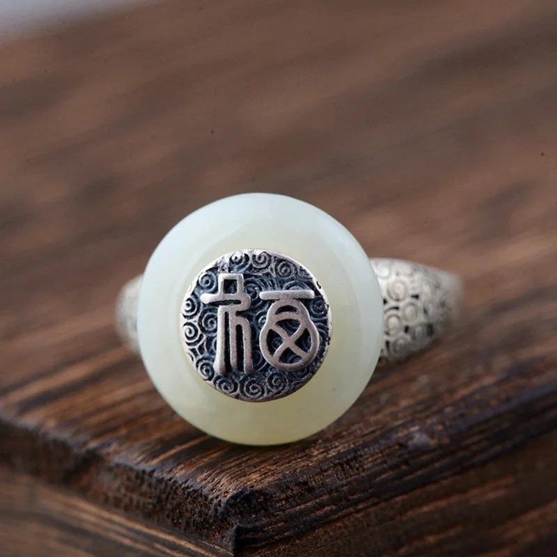 Гарантированный кольца из стерлингового серебра 925 натуральный нефрит китайское слово blessding резьба элегантное регулируемое кольцо ювелирн...