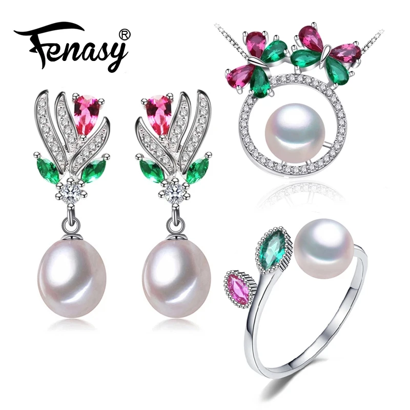FENASY серебро 925 пробы натуральный пресноводный жемчуг ювелирные наборы для жемчужное ожерелье для женщин рубиновые серьги кольцо идея подарок
