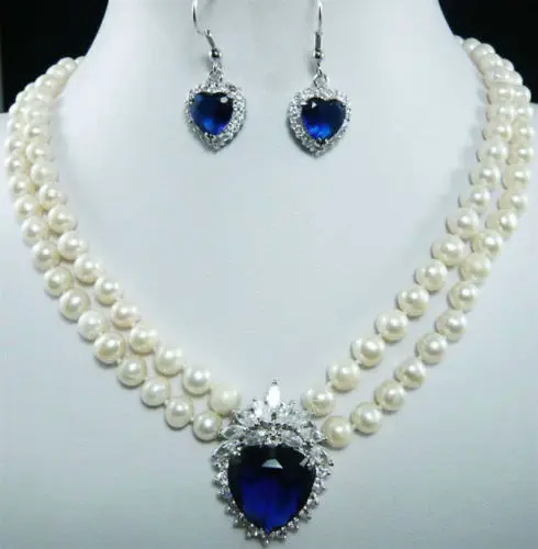 Новый бренд высокого качества Модные картины 7-8 мм натуральный белый жемчуг подвеска с синим кристаллом ожерелье + серьги набор ювелирных и...