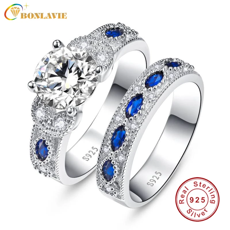 BONLAVIE 1 пара синий сапфир пара обручальных колец 100% 925 пробы Серебряный Forever Love романтический любителей кольца ювелирные изделия