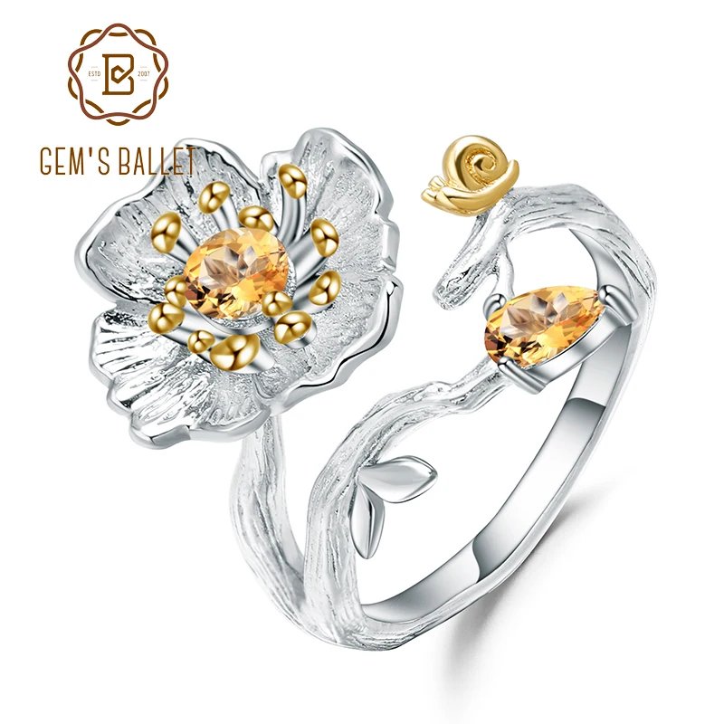 Женское кольцо с натуральным цитрином GEM'S BALLET 0.65Ct, кольцо из стерлингового серебра 925 пробы с цветущими маками
