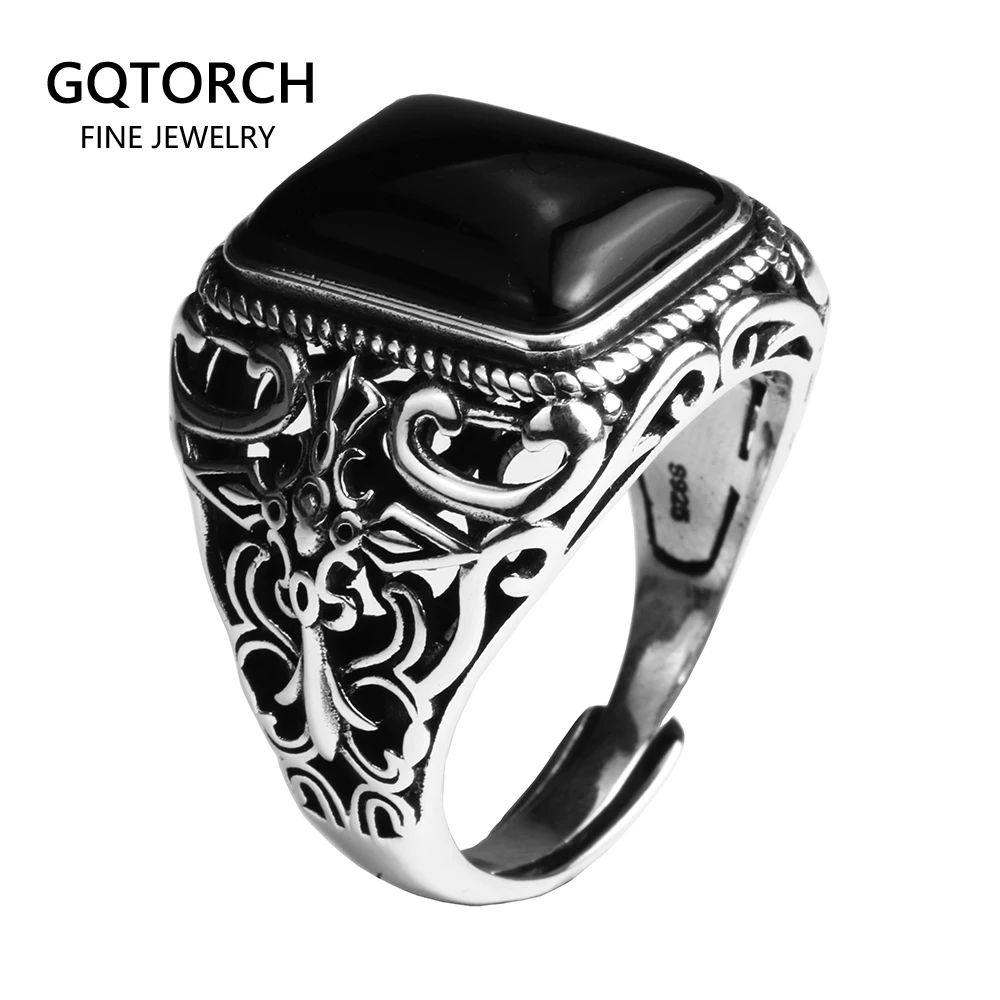 реального чистая стерлингового серебра 925 Винтаж Кольца для Для мужчин натуральный черный оникс камень площади Форма полый крест цветок резные Панк ювелирные изделия
