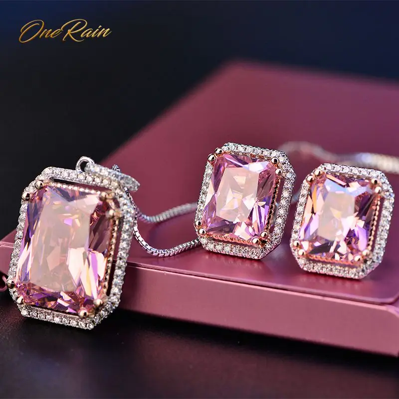 Набор украшений OneRain, винтажный набор из 100% стерлингового серебра 925 пробы, розовые серьги из сапфирового драгоценного камня, шпильки, кольцо, ожерелье, оптовая продажа, 6-9