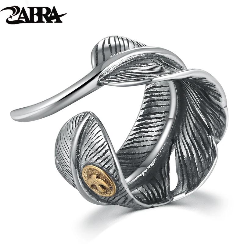 Zabra Реальные серебро 925 Винтаж Перо черный Размеры Регулируемые кольца для Для мужчин Для женщин панк-рок Стиль стерлингового серебра Big Кольца ювелирные изделия