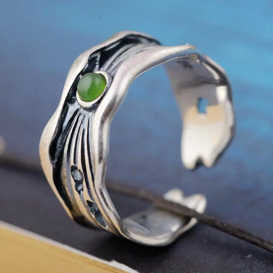 Натуральный камень зеленый нефрит Открытые Кольца для Для женщин Винтаж ветка узор тайские серебряные сердца полый Дизайн Fine Jewelry