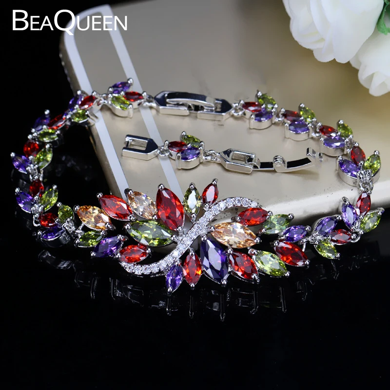 BeaQueen Стерлинговое Серебро 925 летние милые ювелирные изделия с кристаллами большой цветок кластер красочный браслет с камнями циркона для женщин B055