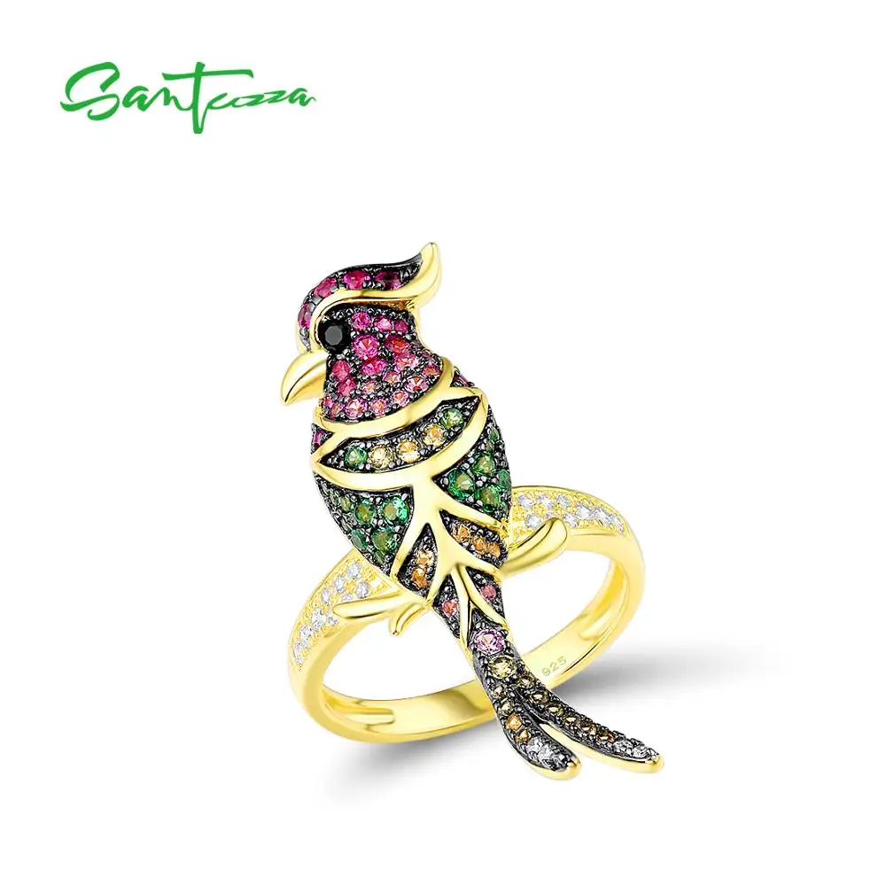 SANTUZZA серебряные кольца для женщин Аутентичные стерлингового серебра 925 золотой цвет милый птица Сверкающие Красочные камни ювелирные изделия
