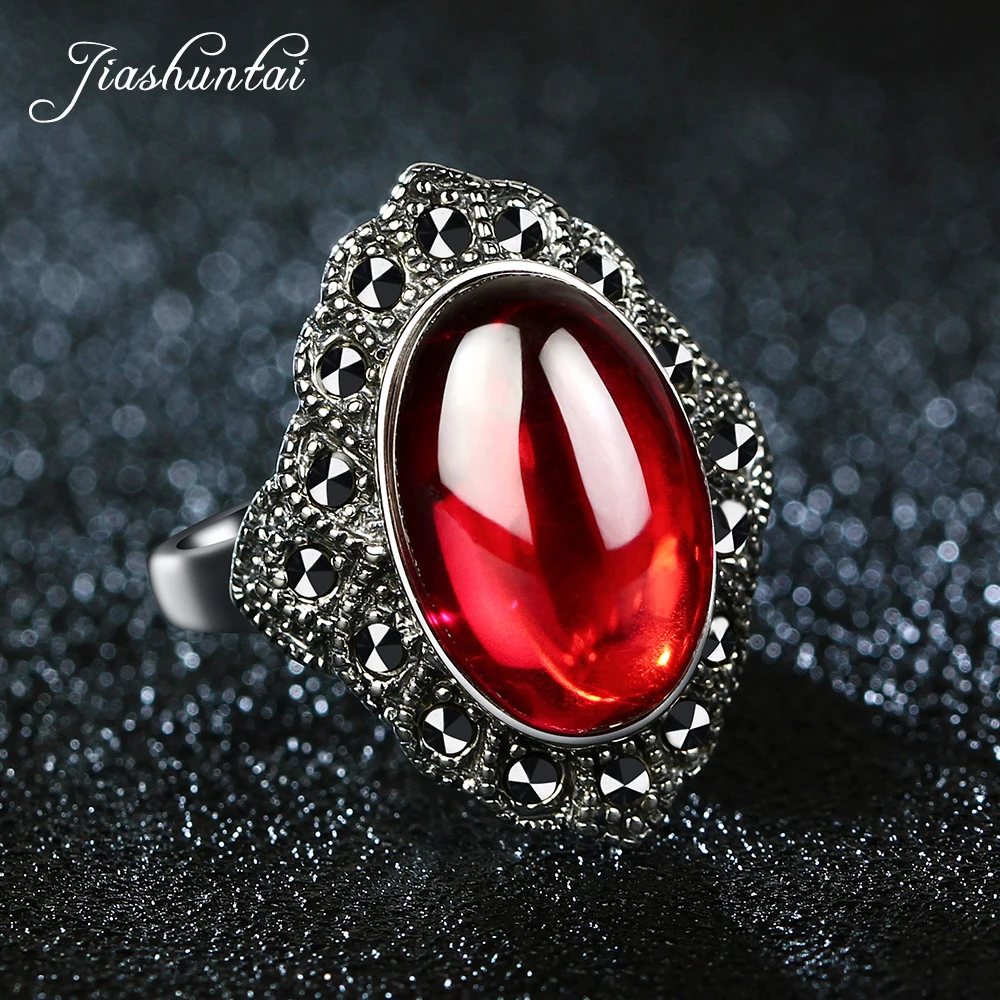 JIASHUNTAI Винтаж 925 пробы Серебряный Красный Гранат Кольца для женщин Ретро Большой овальный в стиле панк R ручной работы Bijoux индийск