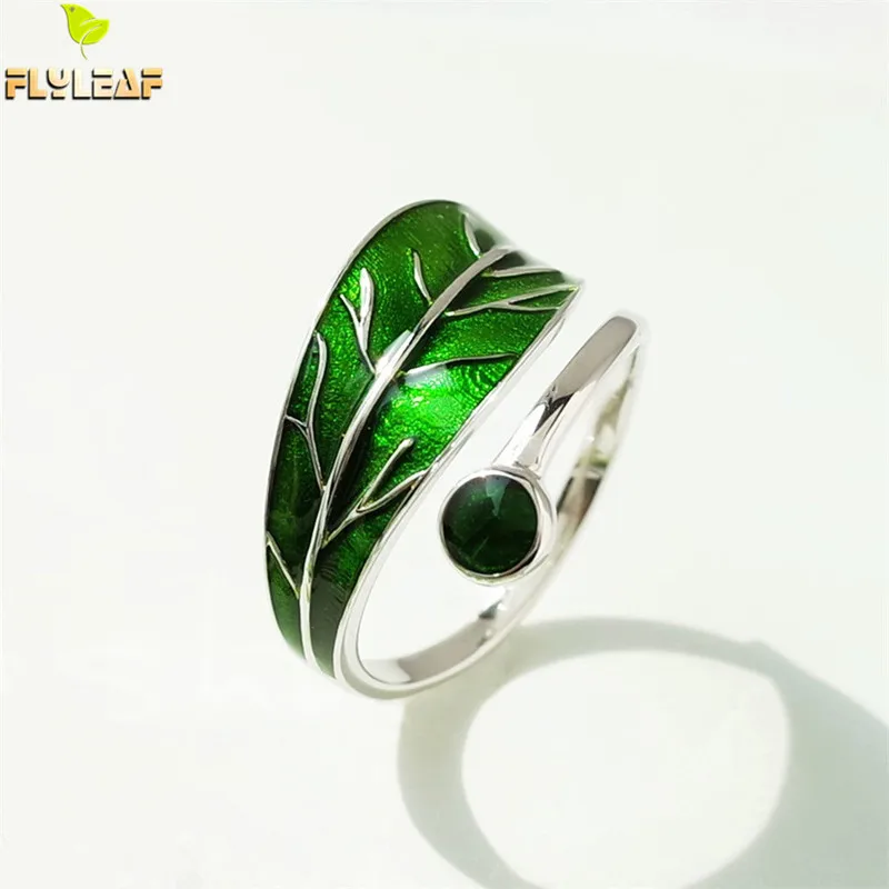 Flyleaf 100% Стерлинговое Серебро 925 пробы с зеленой глазурью имитация листьев Открытые Кольца для женщин креативные женские модные ювелирные изделия