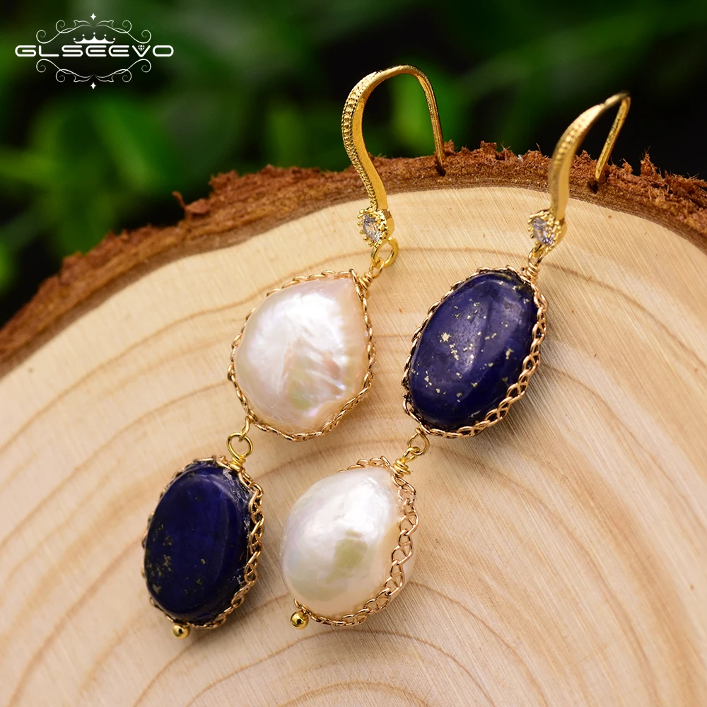 GLSEEVO натуральный камень лазурит воды Висячие серьги пресной воды барокко Жемчуг длинные свисающие серьги для женщин Роскошные ювелирные из...