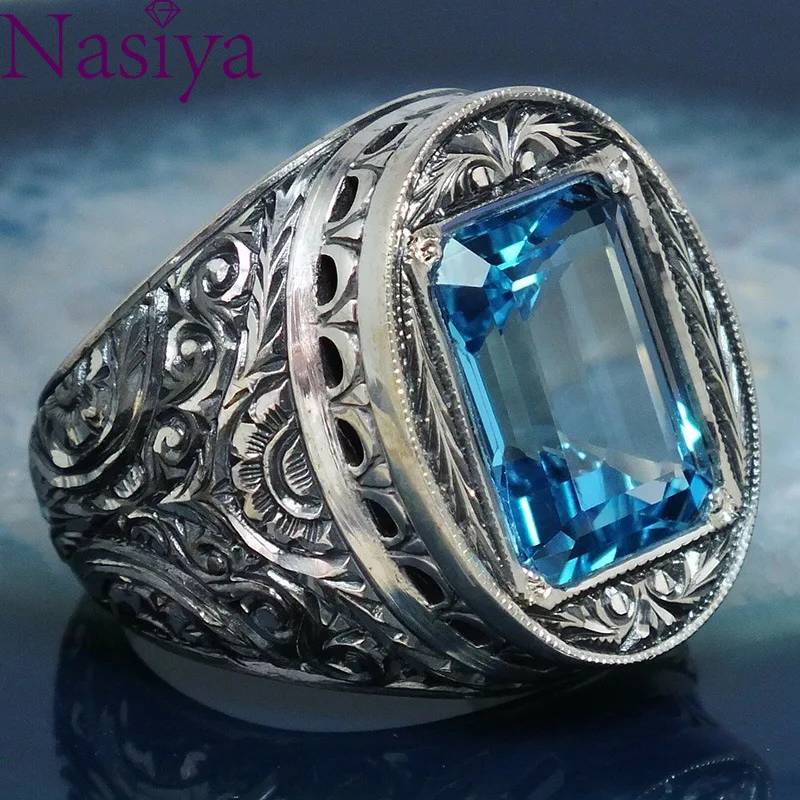 Винтажный стиль резное полое кольцо с синим кристаллом роскошные драгоценности из серебра и камней для мужчин женщин подарок на день рожде...