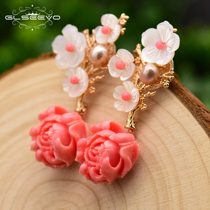 GLSEEVO натуральный красный коралловый цветок красивый Длинные Висячие серьги для Для женщин красный агат серьги 925 пробы серебряные украшени...