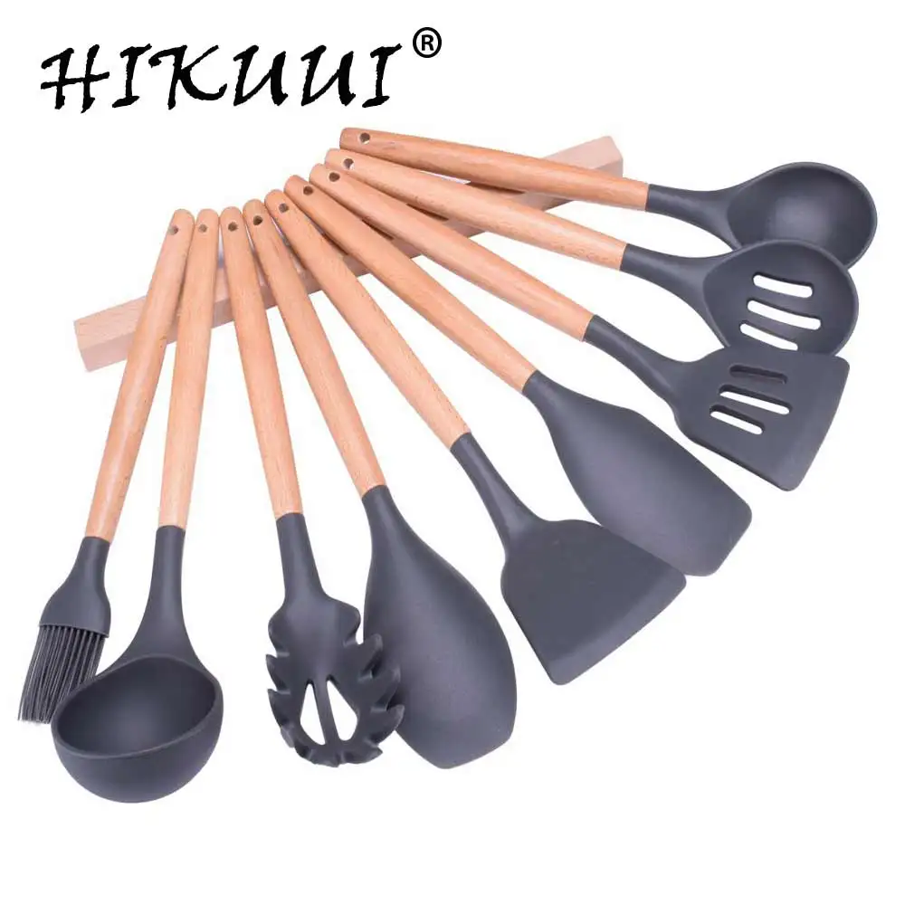 9 шт./компл. Кухня силиконовые Пособия по кулинарии инструменты посуда гаджеты силикона деревянная ручка ложки Буш ковш с антипригарным пок...