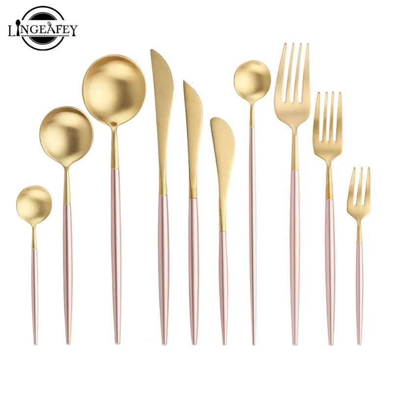 Сталь набор столовых приборов розовая ручка золотой ложкой Ножи вилки палочками десерт Dinneware Западной чайная ложка для Свадебная вечеринка