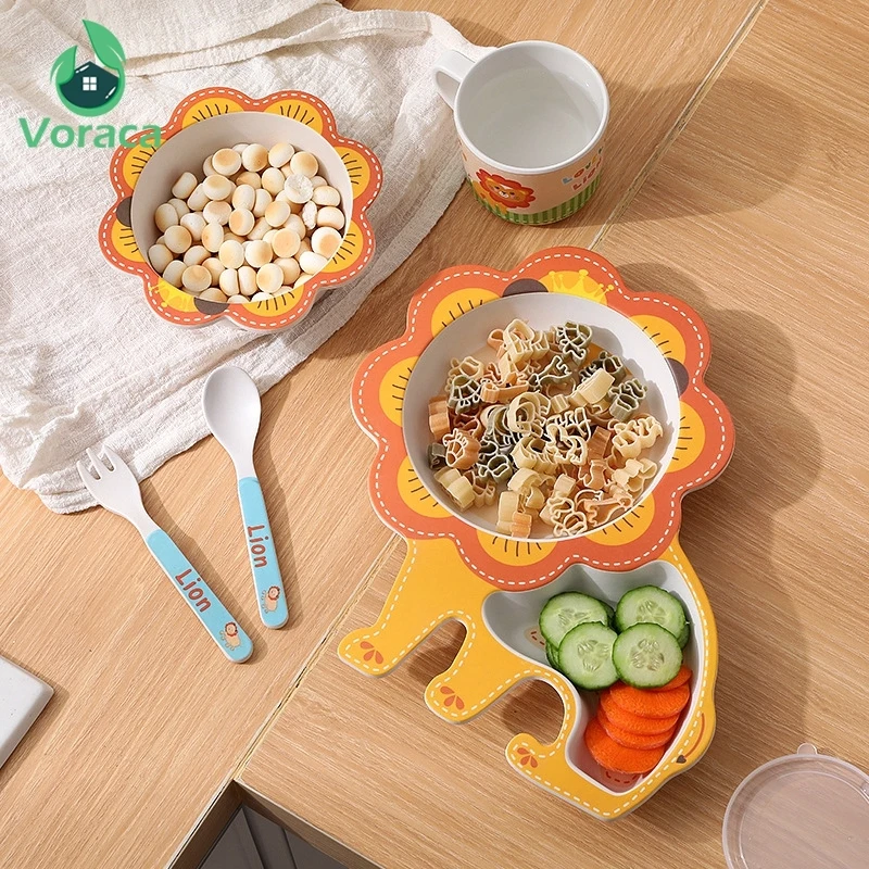 5 шт./компл. из бамбукового волокна с рисунком, детский набор посуды с для тарелочной чаши Вилка чашка деревянной ложкой Творческие Дети Детские посуда для кормления c изображением животных, из столовая посуда