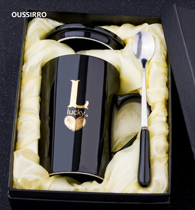 Oussirro 420 мл керамические кофейные кружки пара Тема Счастливый кружка с подарочной коробкой с крышкой и ложкой Рождественский подарок для друзей