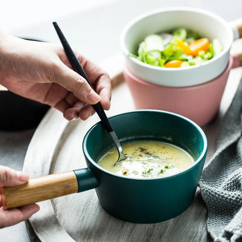 Креативная Скандинавская салатная миска для десерта, чашка для супа с деревянной ручкой 450 мл, овсяная миска для завтрака, йогурта, горячая р...