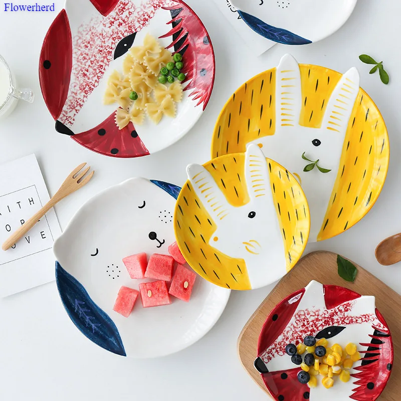 Детская керамическая тарелка с милыми животными, тарелка для детского завтрака, тарелка для десерта, тарелка для закусок, посуда, керамическая посуда