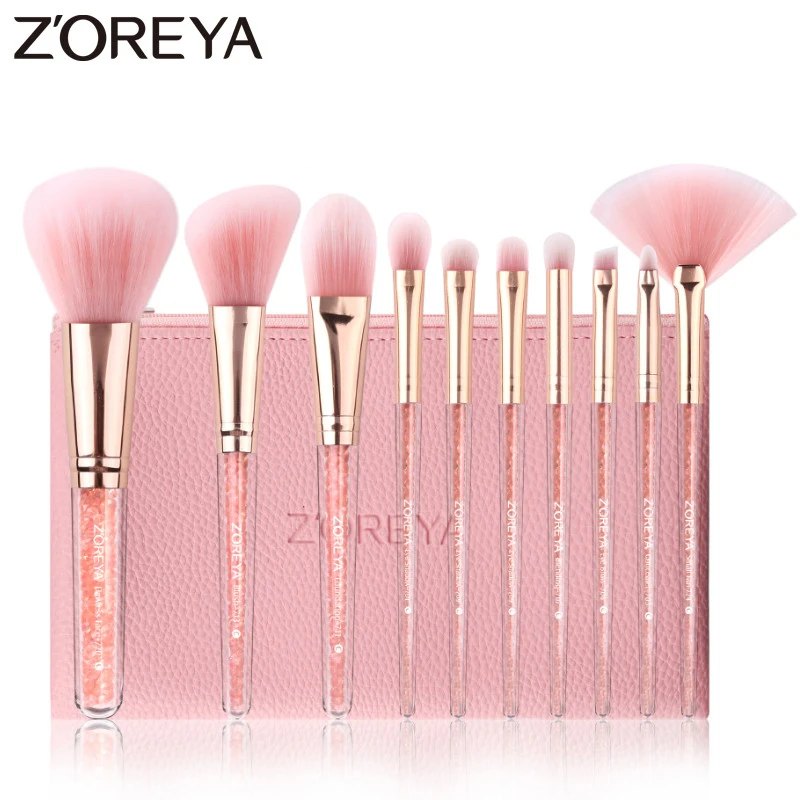 Розовые кисти с стразами для макияжа Zoreya, 10 шт., блестящие тени для век, хайлайтер, кисть с сумкой