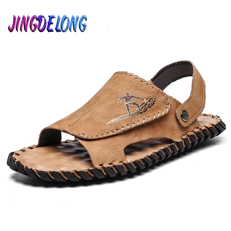 В римском стиле летние Шлепанцы из натуральной кожи Для мужчин сандалии открытые дышащие пляжные сандалии обувь Для мужчин повседневные ту...
