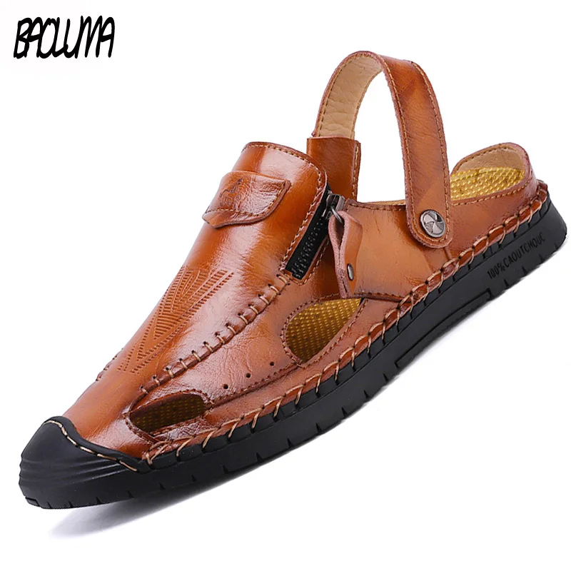 Классические мужские сандалии; дышащие мужские летние пляжные сандалии высокого качества из кожи; мужские римские сандалии на резиновой по...