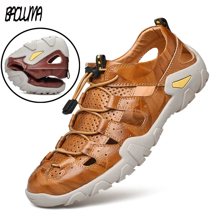2019 Высокое качество для мужчин кожа летние пляжные сандалии для резиновая подошва Рыбак дышащая обувь для отдыха мягкая подошва