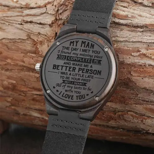 "Мой человек" выгравированное слово полный черный для мужчин эбенового дерева часы Мужской Уникальный кварцевые кожа Валентина Подарки для...