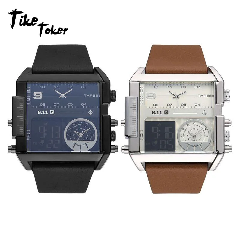 Тике Toker, бренд Для мужчин часы трех часовых поясах аналоговой электроники двигаться Для мужчин t ремень из натуральной кожи Группа Пряжка В...