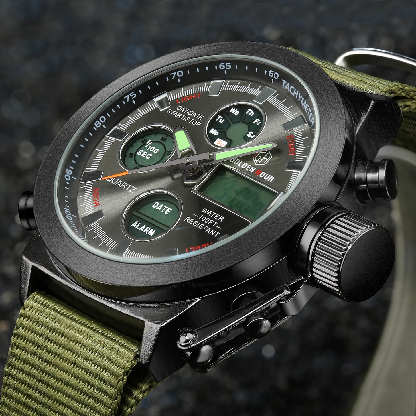 GOLDENHOUR спортивные наручные часы мужские модные повседневное для мужчин кварцевые часы Glow руки неделю дисплей армии Военная Униформа холст р...
