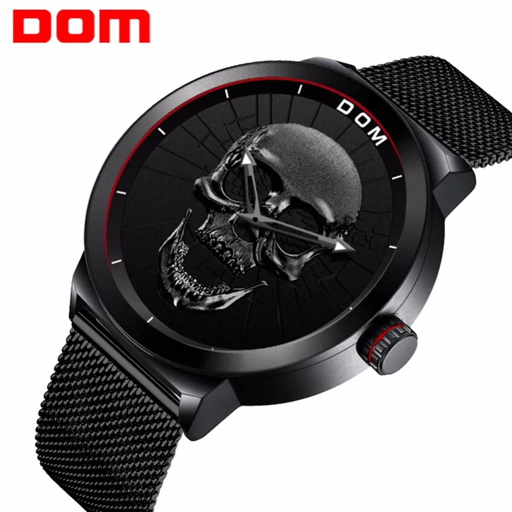 2018 в стиле Панк 3D череп для мужчин часы Бренд DOM Роскошные сталь золотистый и черный Винтаж кварцевые наручные часы спортивные Relogio Masculin