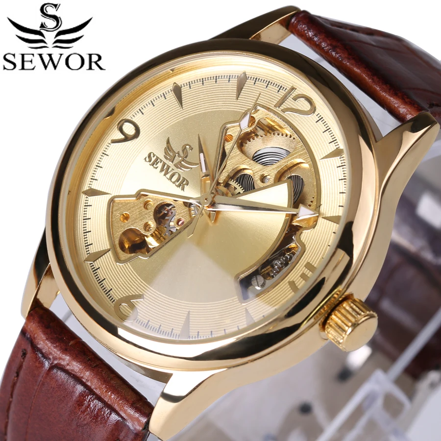 SEWOR бренд механические самовзводные часы с костями модные повседневные мужские часы роскошные часы из натуральной кожи Ремешок 2017