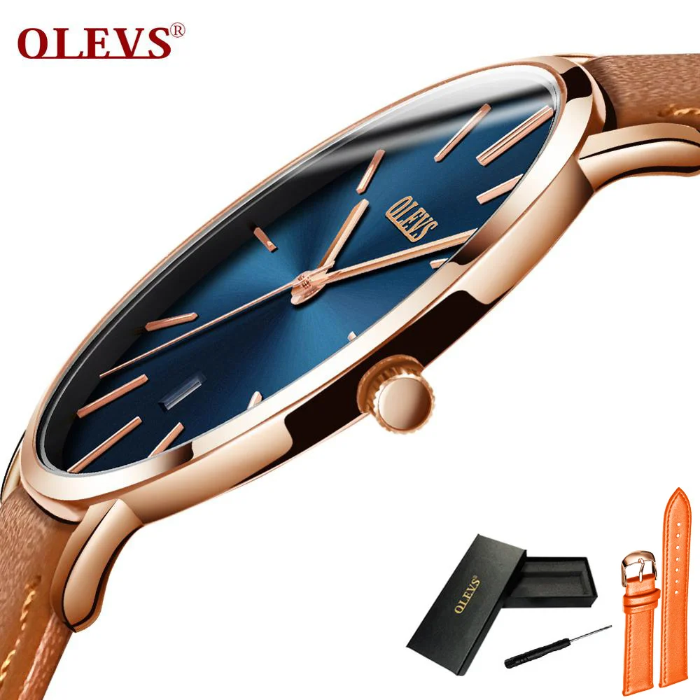 Мужские часы, роскошные брендовые кварцевые часы Olevs с кожаным ремешком в минималистическом стиле, черные ультратонкие водонепроницаемые наручные часы, высокое качество, 2018
