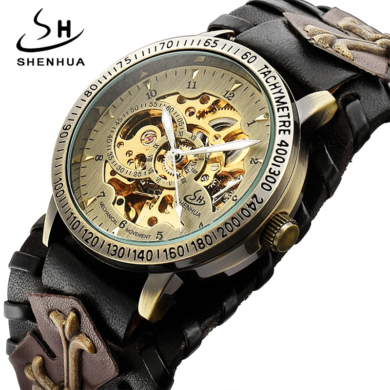 SHENHUA Ретро готический Бронзовый Скелет автоматические механические часы мужские стимпанк самостоятельно заводные часы Tourbillon часы Reloj Hombre