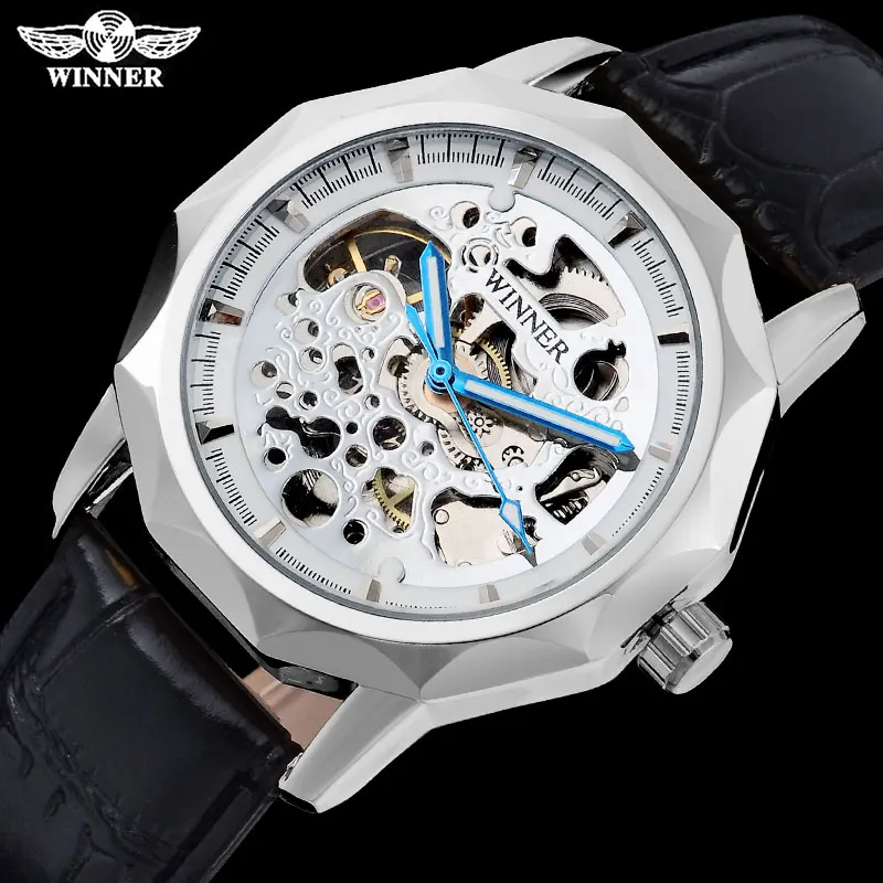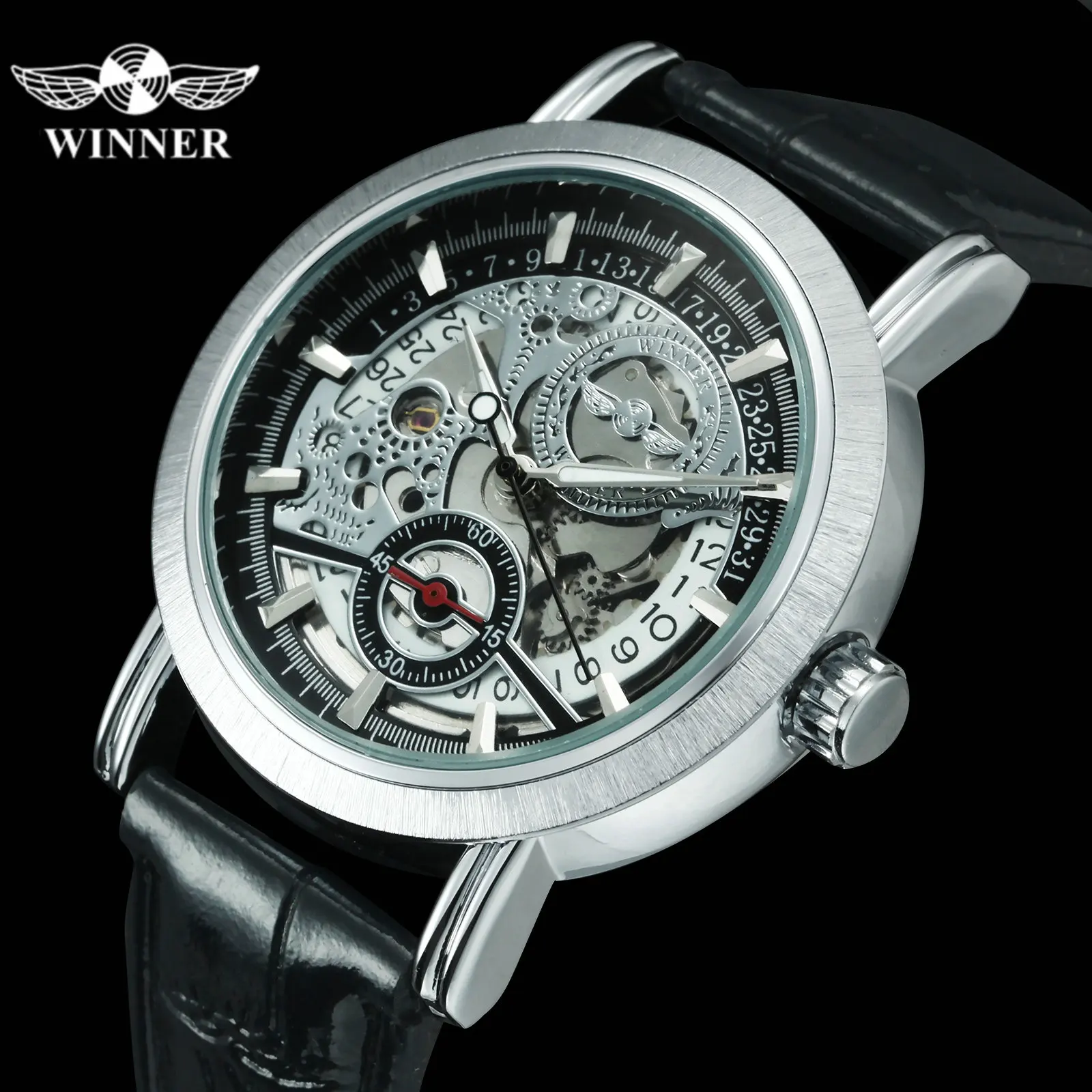 Победитель Официальный Мода повседневное Скелет механические часы для мужчин кожаный ремешок Мода для мужчин s автоматические часы лучший бренд класса люкс