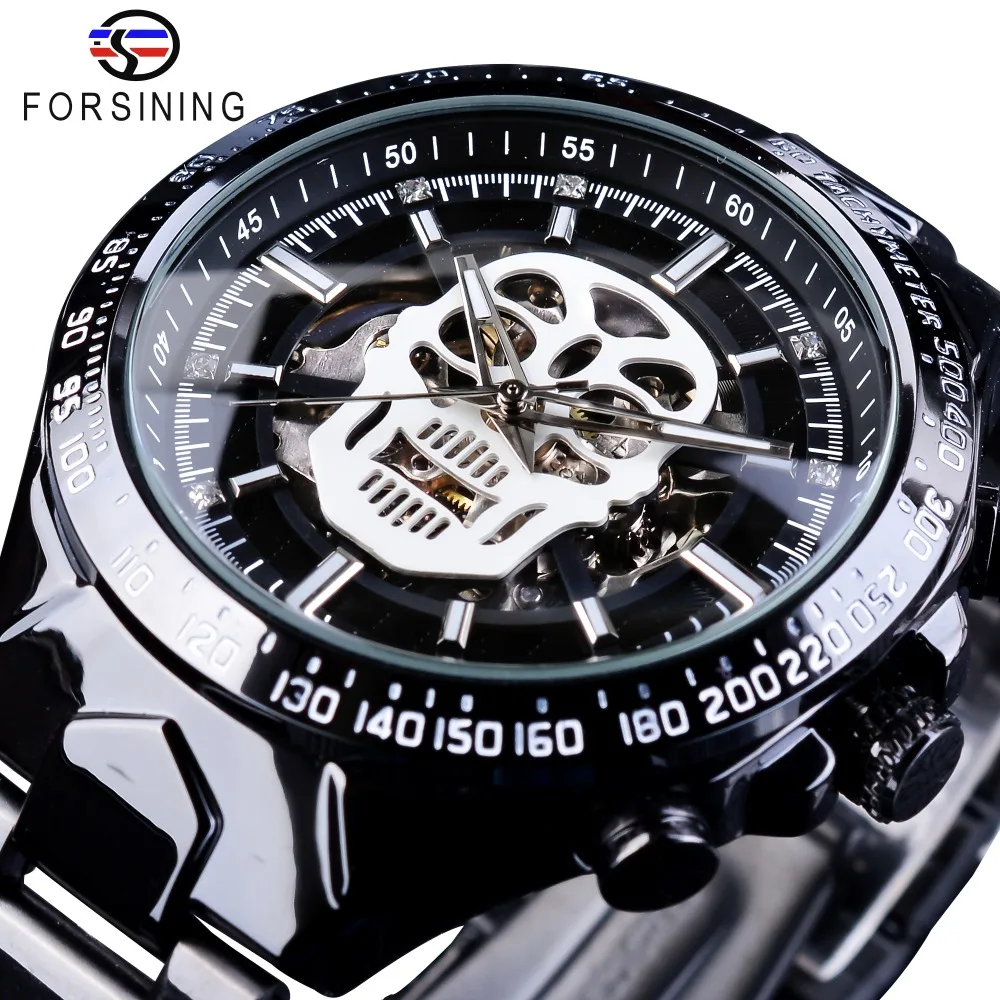 Forsining 2018 стимпанк серии черный Нержавеющая сталь модные белые светящиеся череп Дизайн Для мужчин автоматические часы спортивные часы