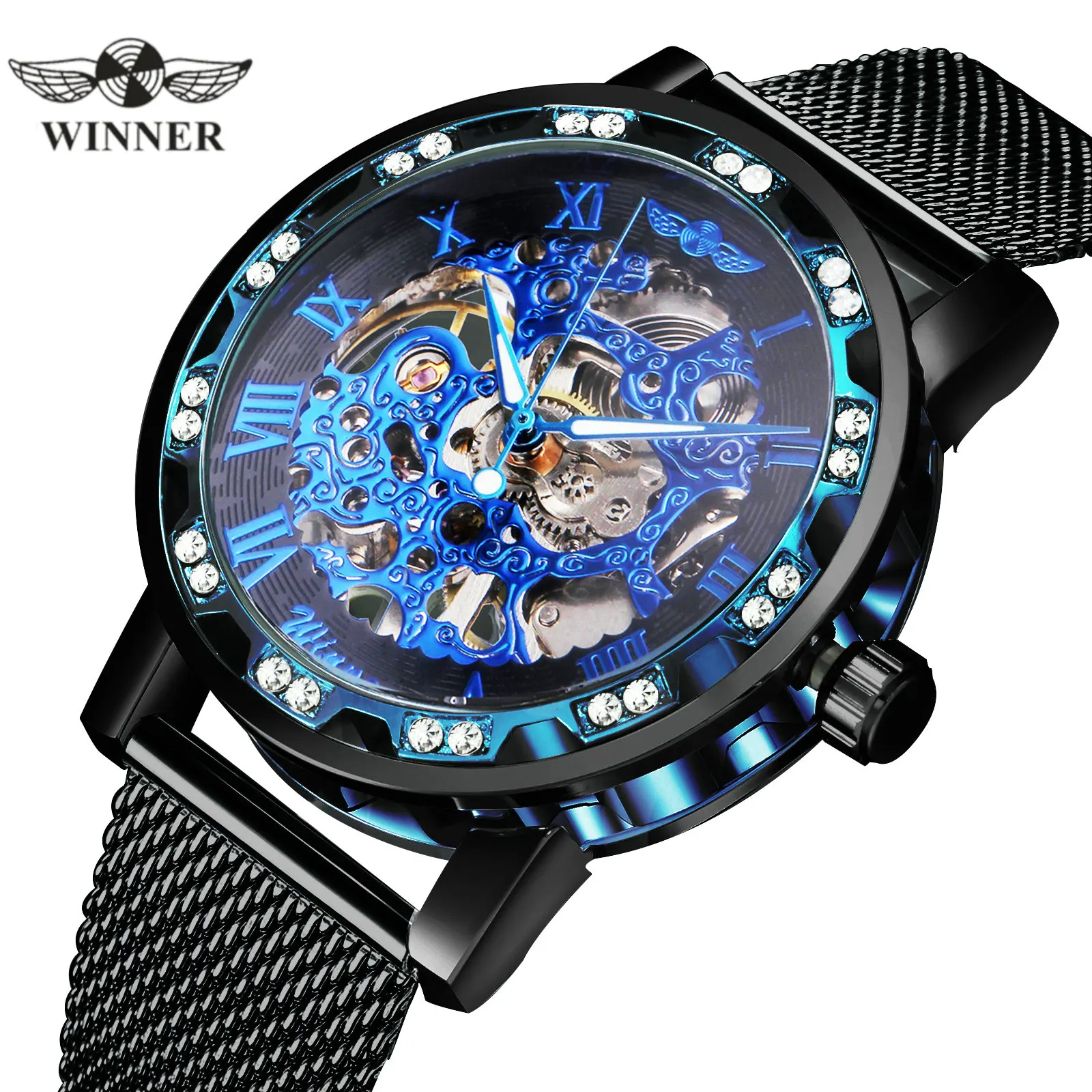 WINNER Скелет механические часы мужские золотые сетчатые ремешок с кристаллами Iced Out мужские s часы лучший бренд класса люкс аналоговые наручн...