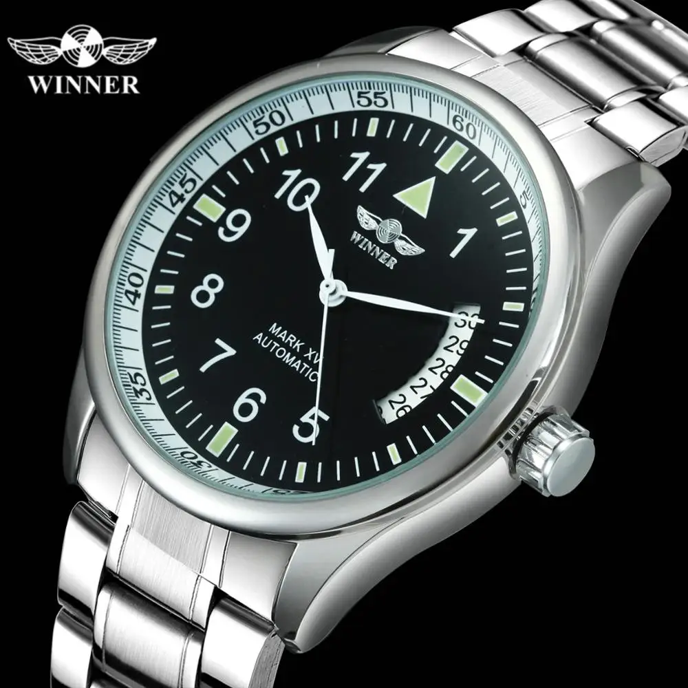 Победитель Мода платье Для мужчин автоматические механические часы Нержавеющая сталь ремешок Календарь черный циферблат городской T-WINNER м...