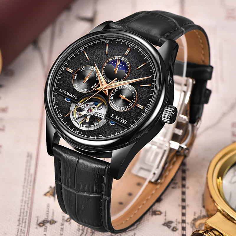 LIGE автоматические механические мужские часы Топ бренд класса люкс турбийон часы мужские водонепроницаемые Дата кожа наручные часы Relogio Masculino