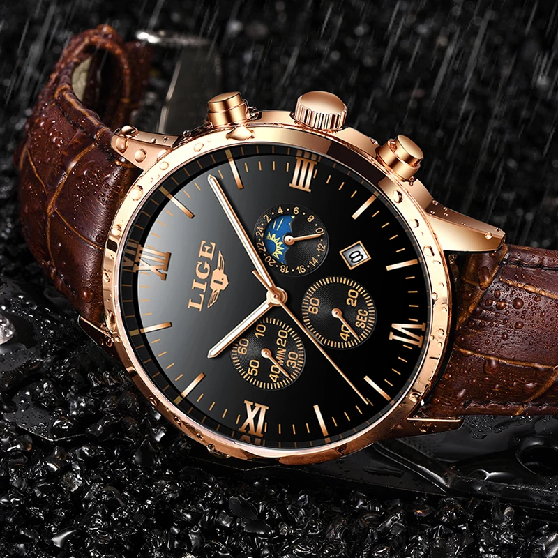 LIGE новые часы мужские спортивные хронограф мужские s часы Роскошные коричневые кожаные водонепроницаемые кварцевые часы с датой часы Relogio ...