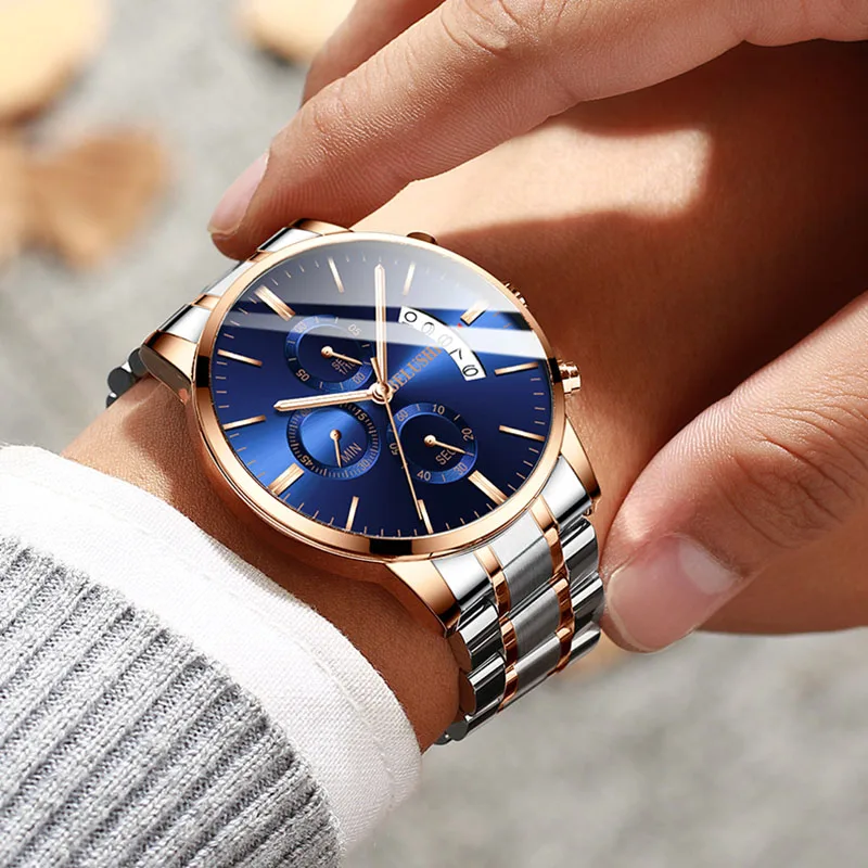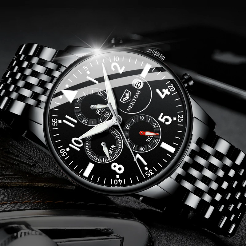 NEKTOM модные хронограф Бизнес наручные часы мужские золотые полностью стальные водонепроницаемые часы