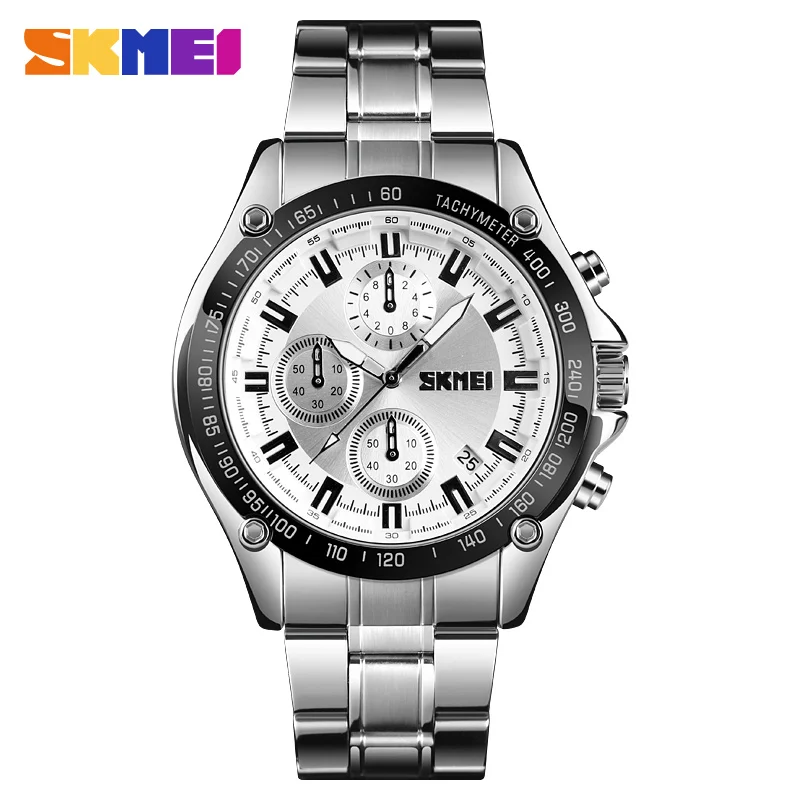 Модный бизнес торговая марка кварцевых часов SKMEI Мужские Роскошные наручные часы из нержавеющей стали мужской браслет хронограф дат диспле...
