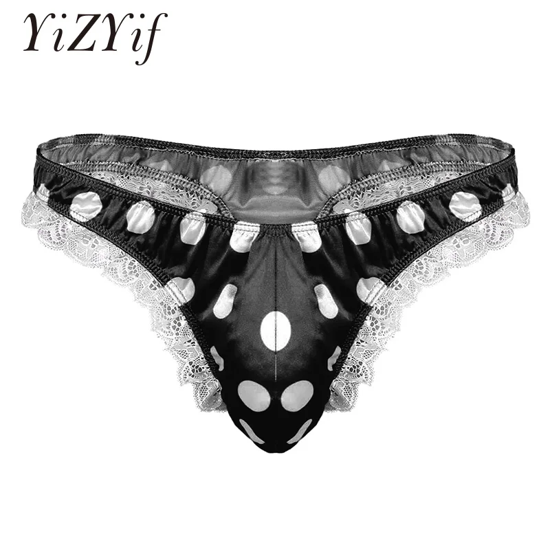Мужские Трусы-стринги, сексуальное нижнее белье, блестящее нижнее белье с низкой посадкой, с оборками и кружевом, в горошек, бикини, стринги, нижнее белье для мужчин