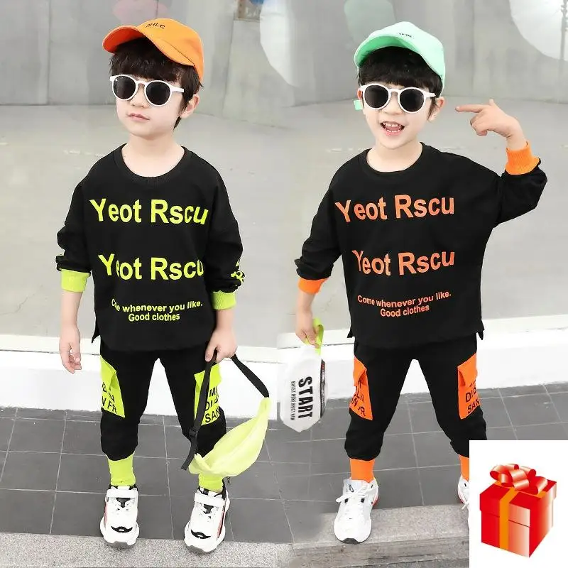 Одежда для маленьких мальчиков, весна 2020, новый костюм с длинными рукавами для мальчиков Повседневный модный костюм с круглым вырезом спортивный костюм в студенческом стиле из двух предметов, От 2 до 9 лет