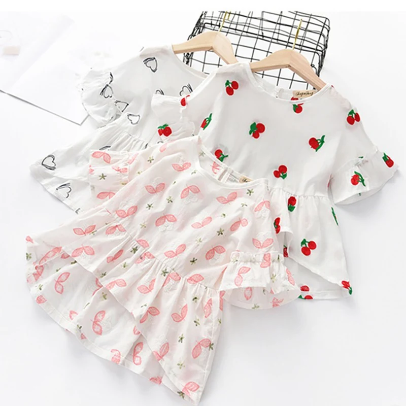 Детская летняя хлопковая Футболка с цветочным принтом и фруктовым принтом для девочек топы, блузка повседневные футболки с расклешенными рукавами, необычный дизайн
